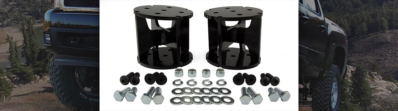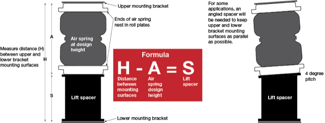Contact the lift kit manufacturer for the height increase of the rear. Choose the spacer that is closest to the increased amount of the lift for the rear of the truck. It is preferred to mount the air spring taller — or slightly stretched — than shorter — or slightly compressed.